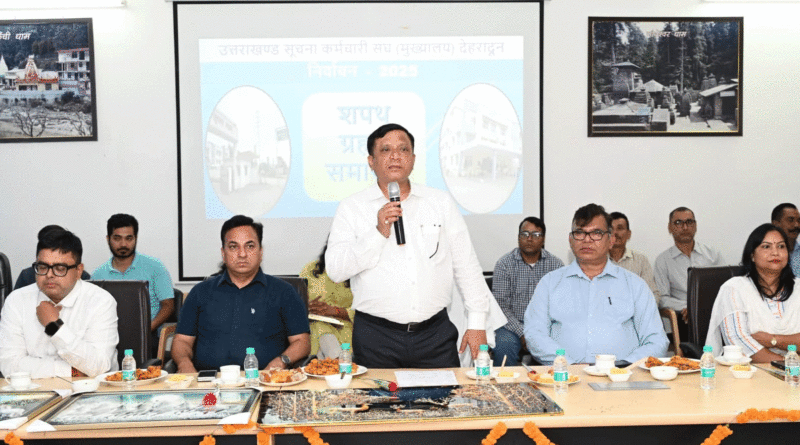 देहरादून, । आज रिंग रोड स्थित सूचना भवन में उत्तराखण्ड सूचना कर्मचारी संघ की नई कार्यकारिणी का शपथ ग्रहण समारोह आयोजित हुआ। कार्यक्रम में महानिदेशक सूचना श्री बंशीधर तिवारी मुख्य अतिथि के रूप में शामिल हुए। श्री तिवारी द्वारा नवनिर्वाचित संघ के पदाधिकारियों का शपथ दिलायी गई।कार्यक्रम को सम्बोधित करते हुए सूचना महानिदेशक श्री तिवारी ने कहा कि कार्मिक हितों का शीघ्र समाधान किया जायेगा। उन्होंने कहा कि सूचना विभाग का कार्य सरकार की नीतियों व योजनाओं का जनहित में व्यापक स्तर पर प्रचार-प्रसार करना है। सभी कार्मिक अपने दायित्वों का पूरी निष्ठा और ईमानदारी से निर्वहन करे। संघ द्वारा रखी गई मांगों का शीघ्र समाधान किया जायेगा। कार्मिकों के लिए विशेष रूप से स्वास्थ्य शिविर आयोजित किए जाएंगे।इस अवसर पर अपर निदेशक श्री आशिष कुमार त्रिपाठी ने संघ की नवनिर्वाचित कार्यकारिणी को बधाई एवं शुभकामनाएं दी। उन्होंने कहा कि विगत समय में भी संघ द्वारा रखी गई मांगों का प्राथमिकता पर समाधान किया गया है।संघ के नव निर्वाचित अध्यक्ष श्री कैलाश रावत ने कहा कि संघ का प्रयास होगा कि कार्मिकों के हितों को शीघ्र समाधान कराया जा सके। इसके लिए अधिकारियों से निरंतर संवाद किया जायेगा। उन्होंने कहा कि आगामी समय में संघ का जनपद स्तर तक विस्तार किया जाएगा।संघ के महामंत्री श्री अंकित कुमार ने कहा कि संघ का उद्देश्य रहेगा कि कार्मिकों के हितां का शीघ्र समाधान हो।इस अवसर पर संयुक्त निदेशक के.एस.चौहान, डॉ. नितिन उपाध्याय, वरिष्ठ वित्त अधिकारी श्रीमती शशि सिंह, उप निदेशक, मनोज कुमार श्रीवास्तव, रवि बिजारनिया सहायक निदेशक एल.पी.भट्ट, पूर्व अध्यक्ष रणजीत सिंह बुदियाल, पूर्व महामंत्री के.एस.पंवार एवं सुरेश चन्द्र भट्ट सहित समस्त विभागीय अधिकारी एवं कर्मचारीगण उपस्थित थे।कार्यक्रम में अध्यक्ष पद पर श्री कैलाश रावत, उपाध्यक्ष पद पर संयुक्त रूप से श्री प्रशांत रावत, श्री संजय कुमार, महामंत्री पद पर श्री अंकित कुमार, संयुक्त मंत्री पद पर श्रीमती पारूल, कोषाध्यक्ष पद पर श्री राकेश कुमार धीवान, संगठन मंत्री पद पर श्री सत्येंन्द्र बिजल्वाण, संयोजक/ऑडिटर पद पर श्री अरूण कुमार, प्रचार मंत्री पद पर श्री बहादुर सिंह कन्याल, कार्यकारिणी सदस्य के रूप में श्री बालम सिंह नगरकोटी, पप्पू चौहान, आरती गुणवंत, चन्द्र बल्लभ, माधुरी सेमल्टी, भरत रावत, गोपाल बिष्ट, विजय रावत द्वारा शपथ ग्रहण की गई।